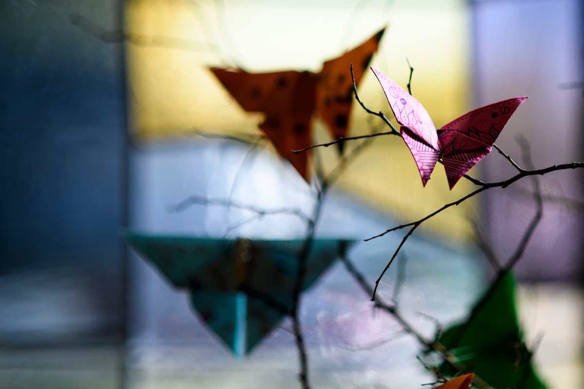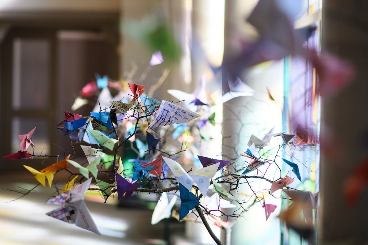 Small trees covered in origami butterflies line the stained-glass windows to mark International Day for the Elimination of Violence Against Women on Nov. 25.