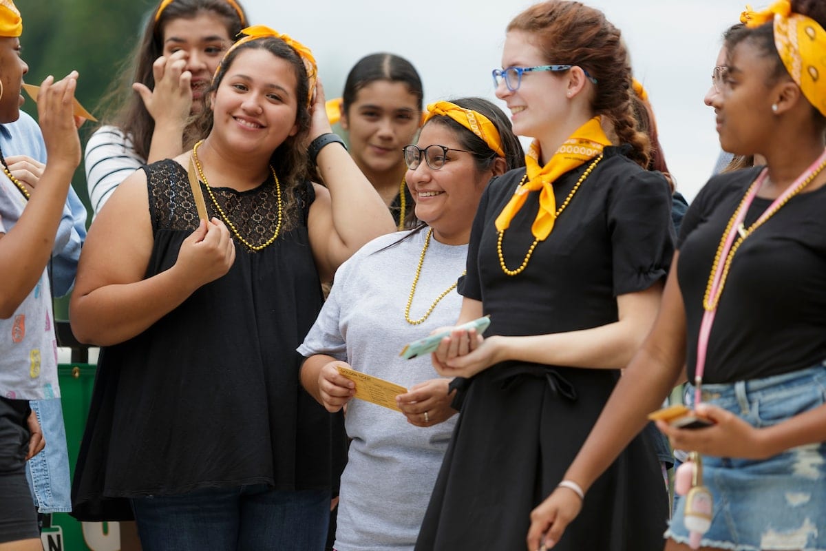 - Brightly smiling students at Brenau University campus, engaging in outdoor activities with vibrant yellow accessories, showcasing inclusive community and student life.