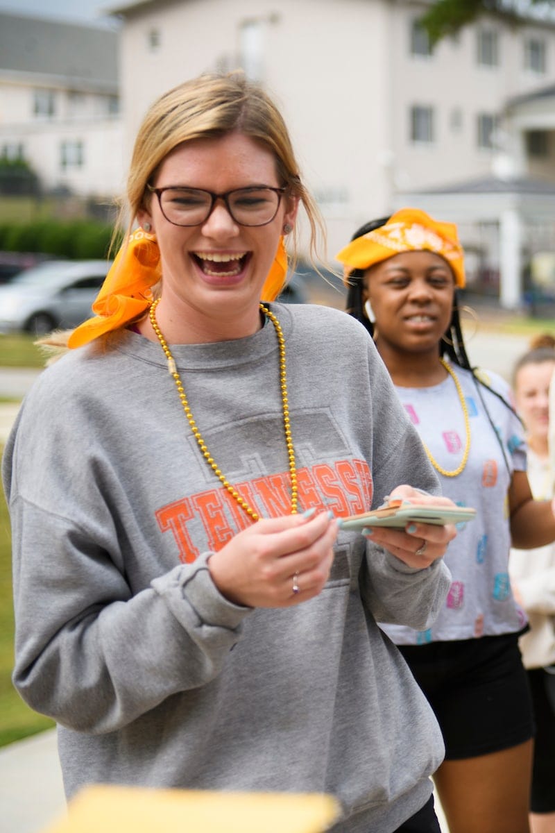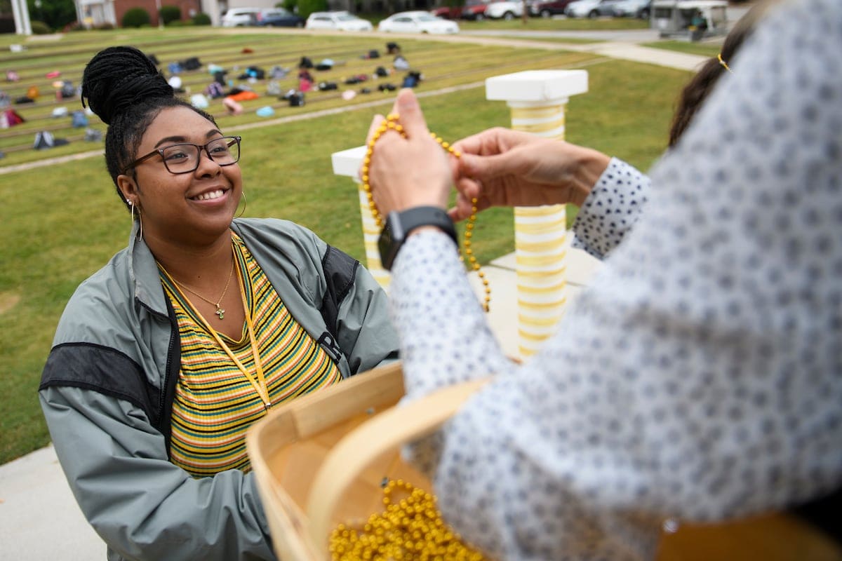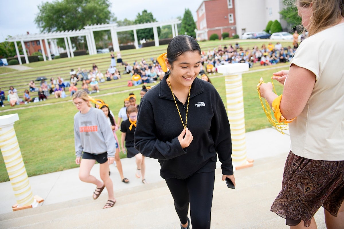 Students lined up to receive a golden necklace and their ticket, which included a list of their Gold Team of advisors and instructors and community connection events at Brenau. The ceremony was held Wednesday, Sept. 18, at the Brenau Amphitheater.