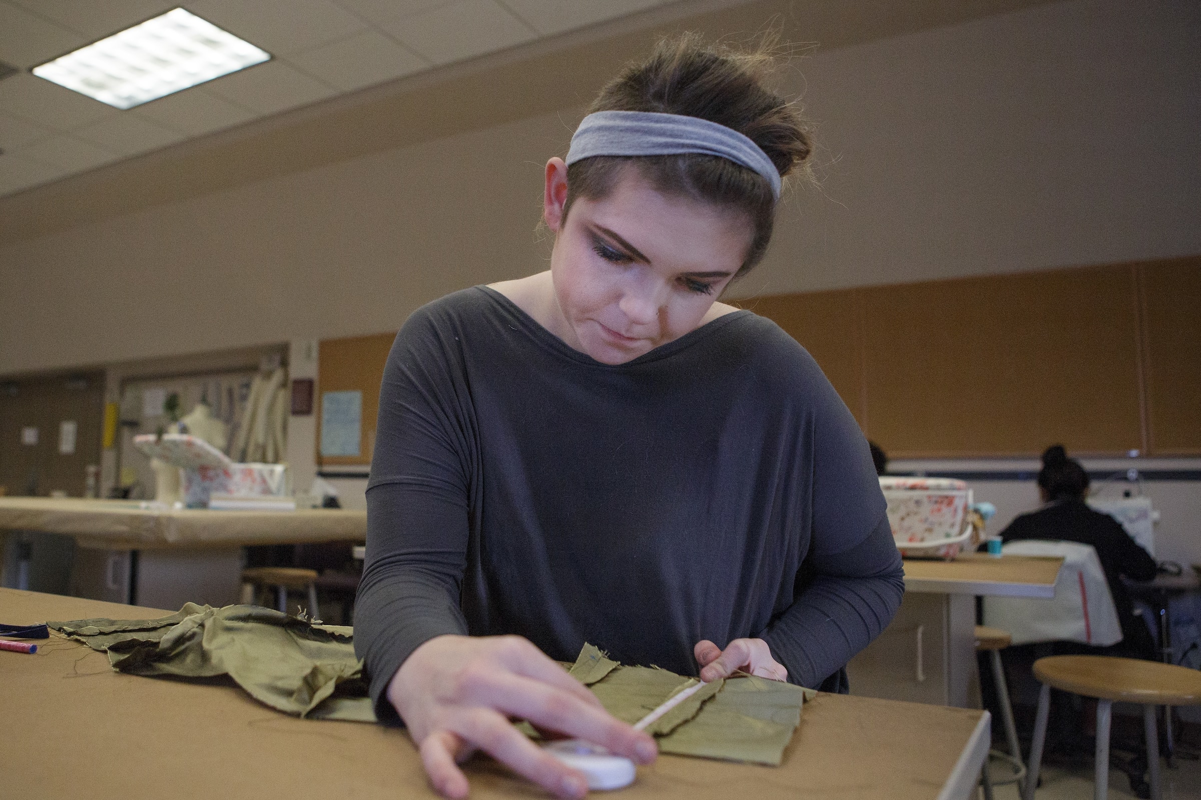 - Destiny Dingle uses a surger in the Fashion Lab as part of a design in her Senior Capstone project.