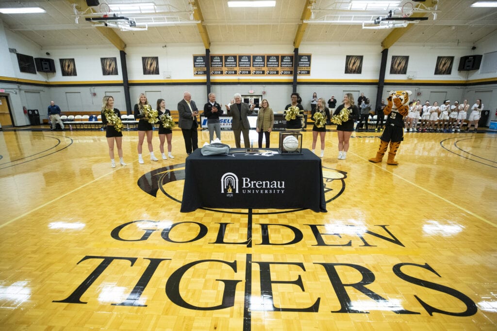 During the ceremony, Interim President David L. Barnett and Lochstampfor thanked the Schraders for their contributions to Brenau athletics and the university as a whole. The ceremony also included Brenau cheerleaders, HJ the Golden Tiger mascot, and current students.