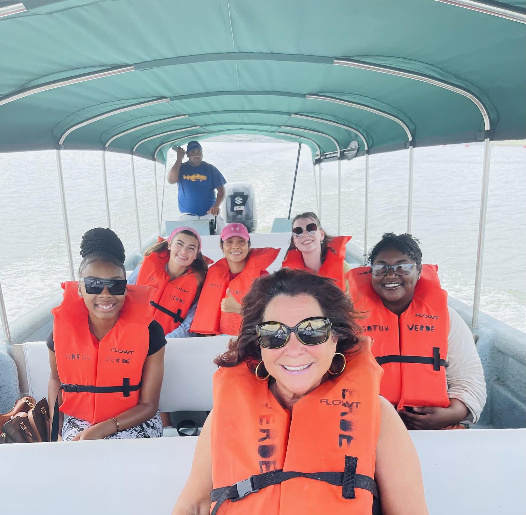 - Enjoying a scenic boat tour on the lake with Brenau University students and faculty, showcasing outdoor learning and university community activities.