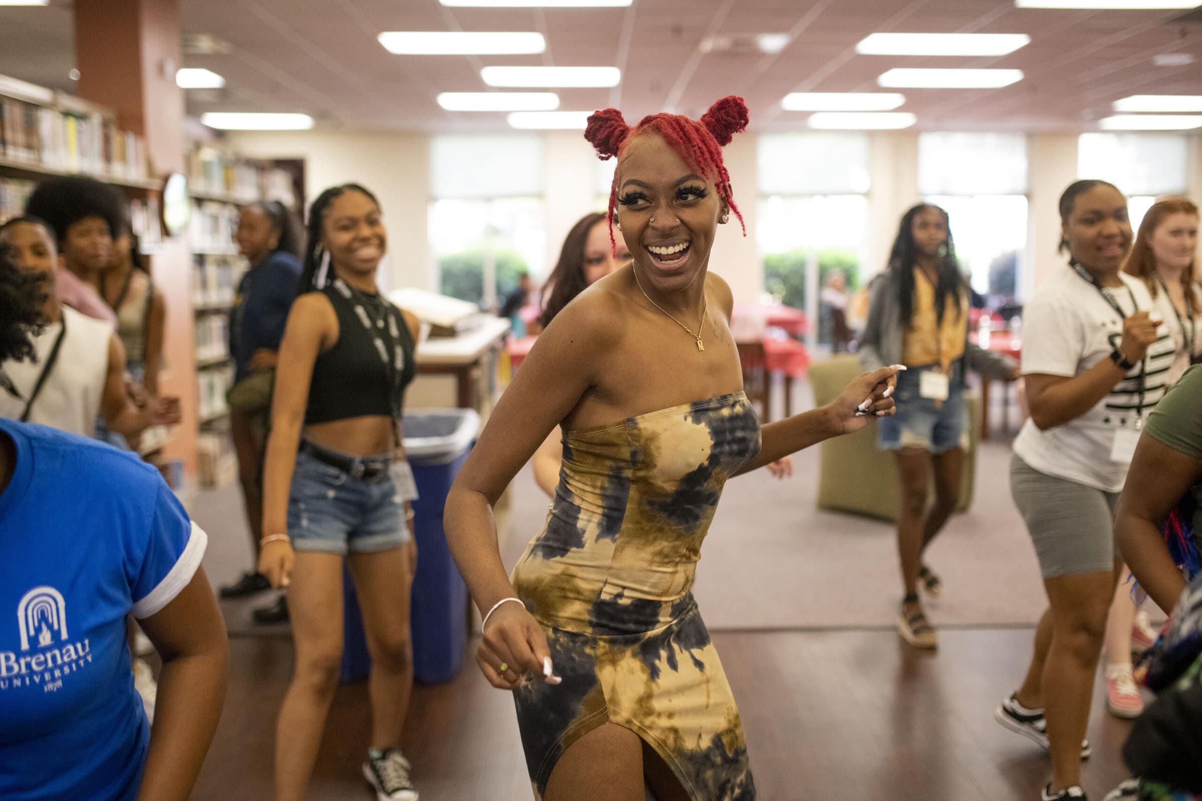 - Vibrant students dancing and socializing inside Brenau University library during campus event, showcasing college life and student engagement.